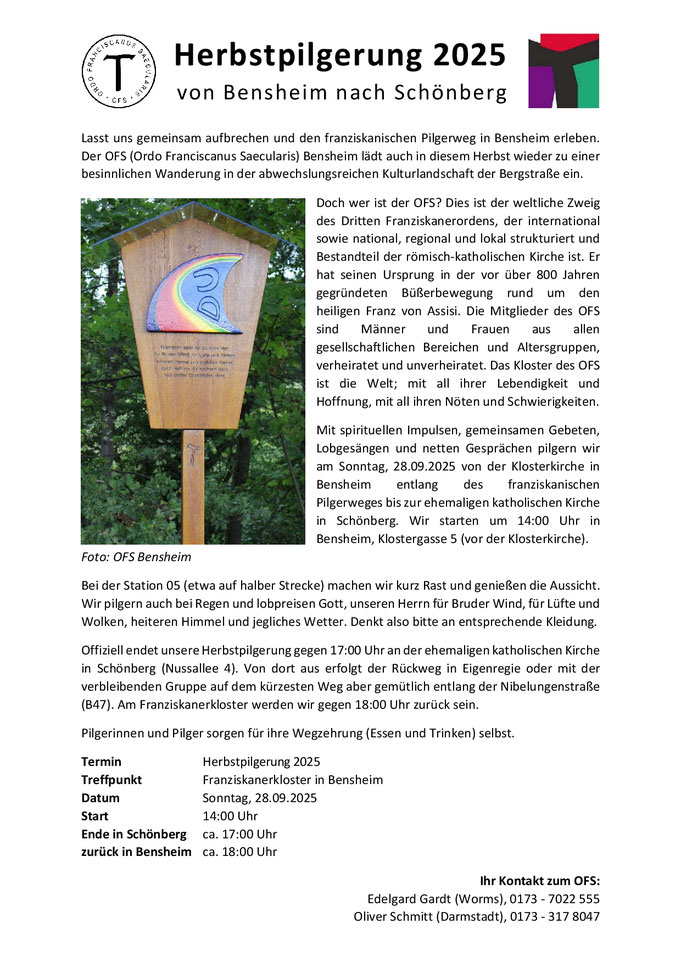 Dann kommt doch zu unserer Herbstpilgerung am franziskanischen Pilgerweg in Bensheim. Diese findet am Sonntag, 28.09.2025 statt und wir würden uns sehr freuen, wenn viele Menschen dabei sind. Wir beginnen um 14:00 Uhr an der Klosterkirche in Bensheim, wo die Station 01 steht und machen uns dann gemeinsam auf den Weg bis zur Station 10 an der ehemaligen katholischen Kirche St. Elisabeth in Schönberg ...